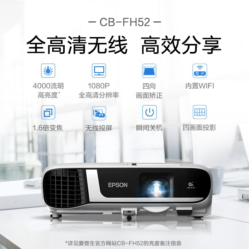 • 爱普生CB-FH52 投影仪 投影机办公 培训(1080P全高清 4000流明 手机同屏 1.6倍变焦)