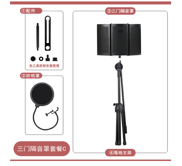 • 奥利亚麦克风录音棚隔音罩话筒防风屏防喷网吸音罩防噪音降噪板三门 三门隔音罩+支架+