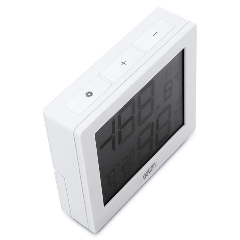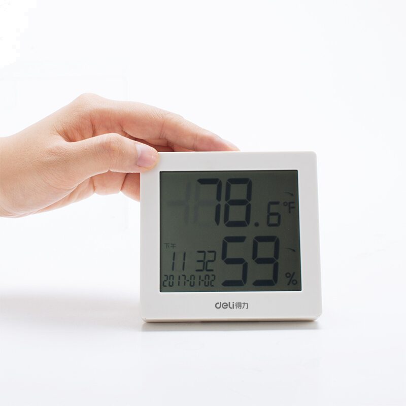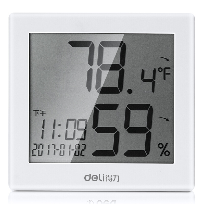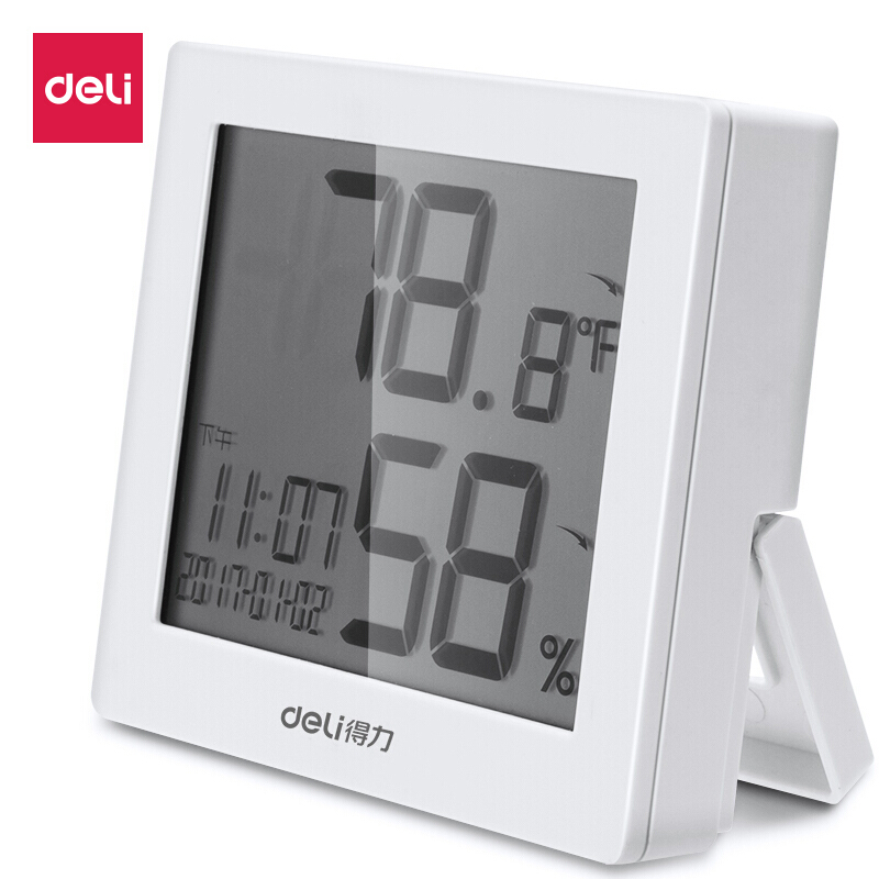 得力(deli)LCD带时间闹钟电子温湿度计 婴儿房室内温湿度表 办公用品 白色8813