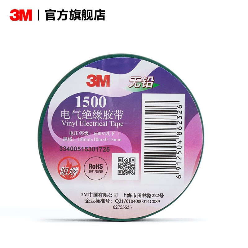 • 3M 1500# 无铅电气(电工)绝缘胶带 汽修家装 耐磨防潮耐酸碱 绿色