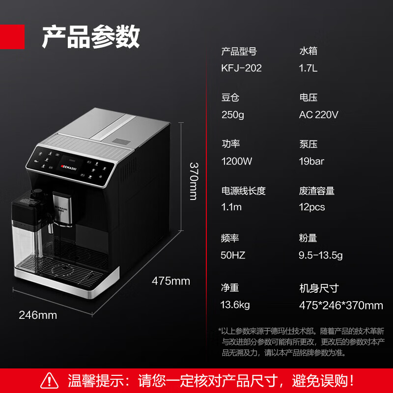 • 德玛仕(DEMASHI)现磨咖啡机商用全自动饮料机半自动意式咖啡器家用多功能办公室研磨一体式磨豆机器KFJ-202