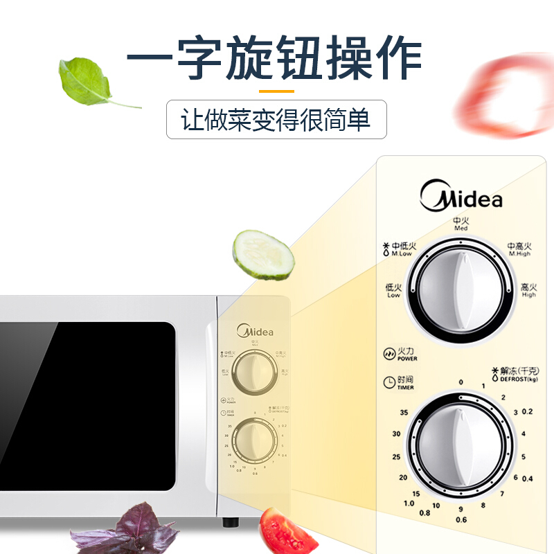 美的(Midea)M1-L213B 21升 快捷微波炉 家用小型迷你 360°转盘加热 旋钮操控 精准控温 五档火力 易洁内胆