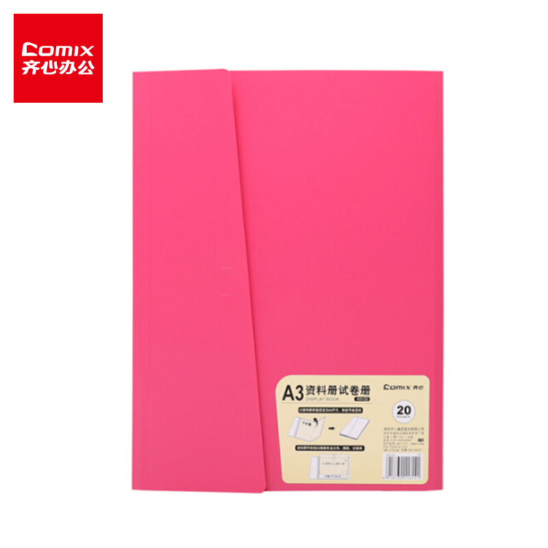齐心(Comix)A3/20页资料册 可装A3尺寸 对折款学生试卷收纳册 活页插袋文件夹文件册 桃红A3122