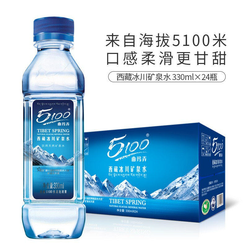 • 5100 西藏冰川 饮用天然矿泉水330ml*24瓶 弱碱性水 整箱装