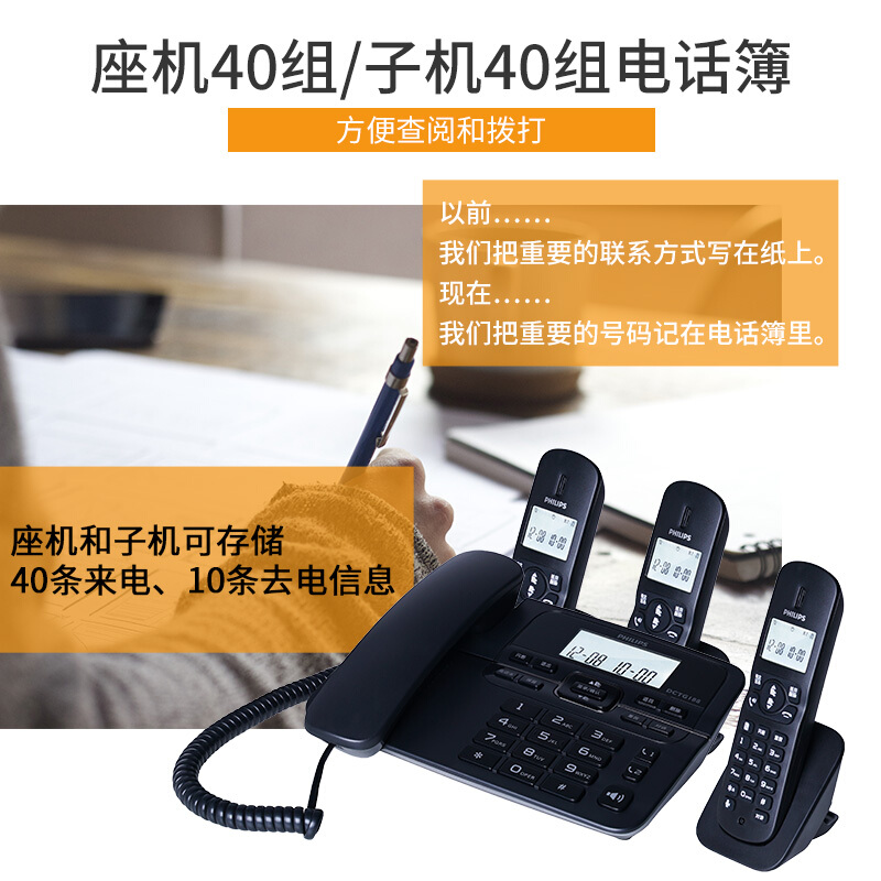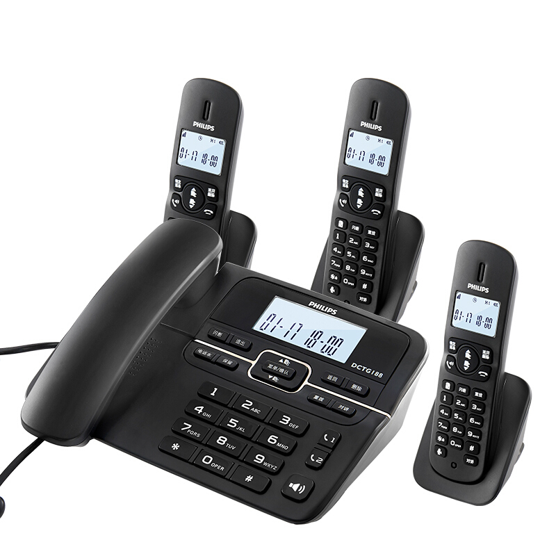 飞利浦DCTG188 HWDCD9889(188)TSD数字无绳电话机办公家用座机电话子母机免提通话/一键拨号/一拖三(黑色)