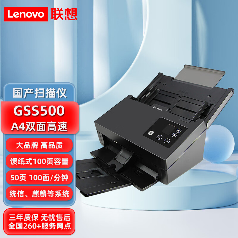 • 联想(Lenovo)扫描仪GSS500【国产化】 A4幅面高速馈纸式高清扫描仪 50ppm/100ipm/自动双面扫描