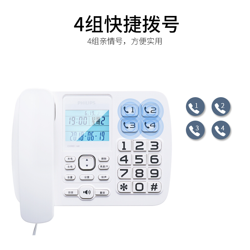 飞利浦(PHILIPS)CORD168电话机座机 固定电话 办公家用 来电报号 大屏大按键 老人机 白色
