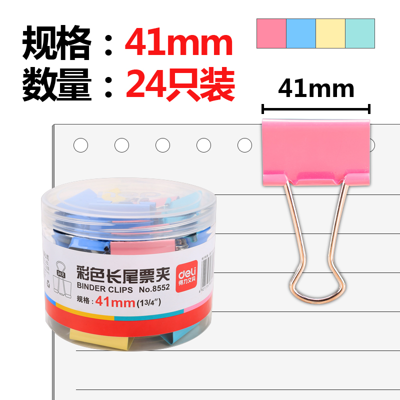 得力(deli)24只41mm彩色长尾票夹 金属票据夹燕尾夹铁夹子 大号8552