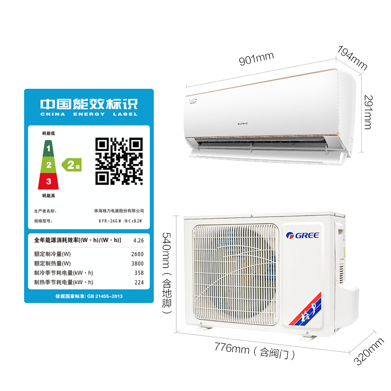 格力 KFR-26GW/NCcB2W 凉之静Ⅱ 大1匹 二级能效 变频 冷暖 京东微联 壁挂式空调挂机