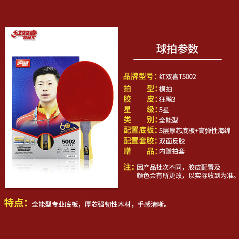 • 红双喜(DHS)五星乒乓球拍横拍双面反胶T5002全能型单拍专业套胶 附新型拍套