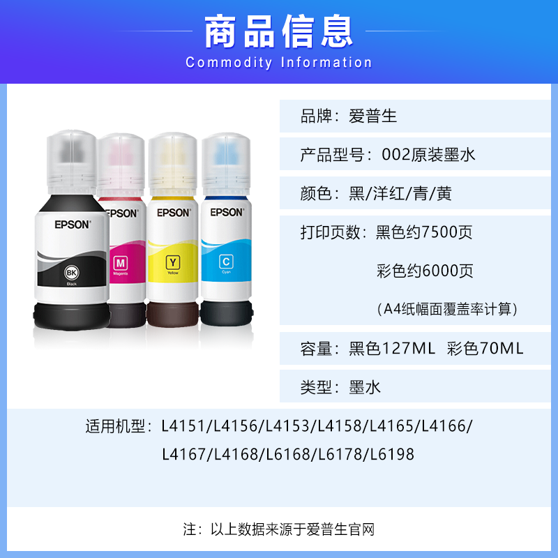 爱普生(EPSON)002系列原装墨水黑色(适用机型L415X/L416X/L616X/L617X系列及L6198)