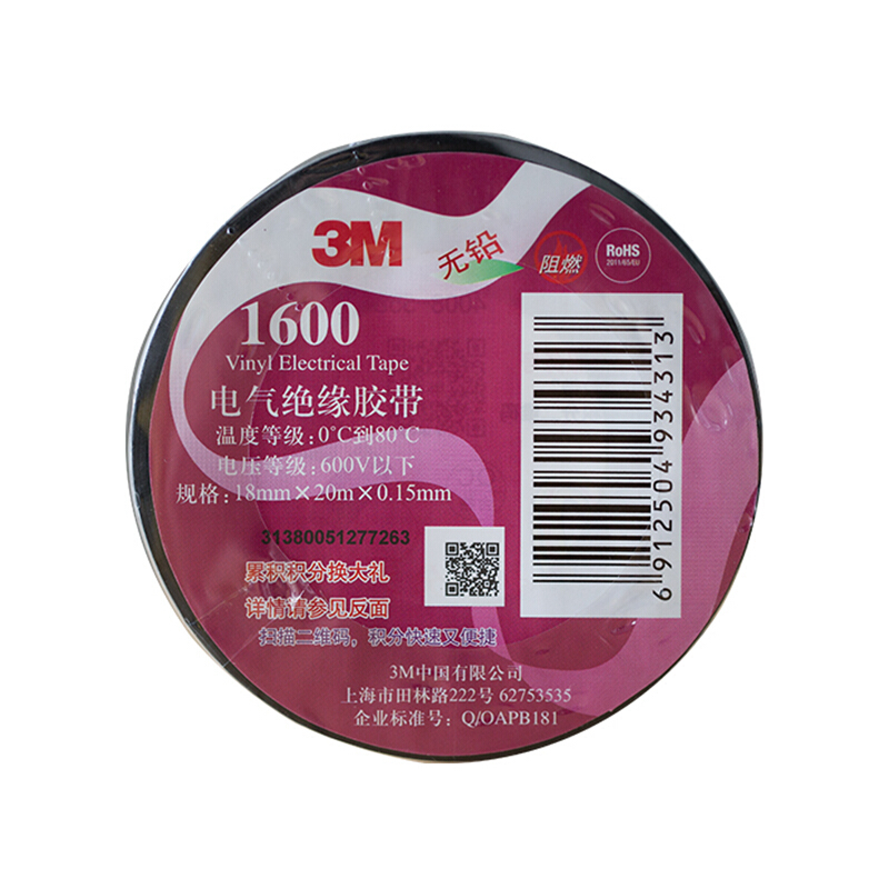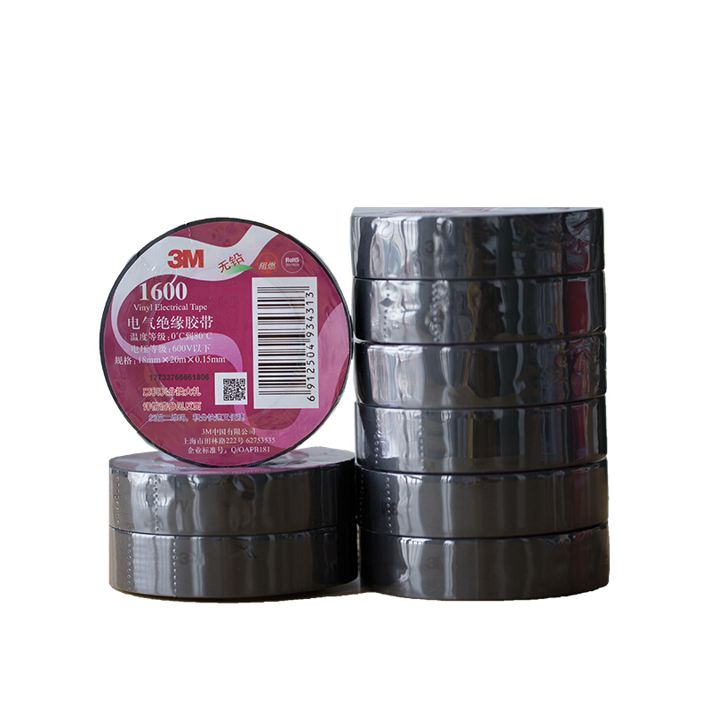 • 3M 1600电工胶带 电气绝缘胶带 PVC电工胶布 无铅耐磨防潮耐酸碱【黑色18mm*20m*0.15mm】一卷