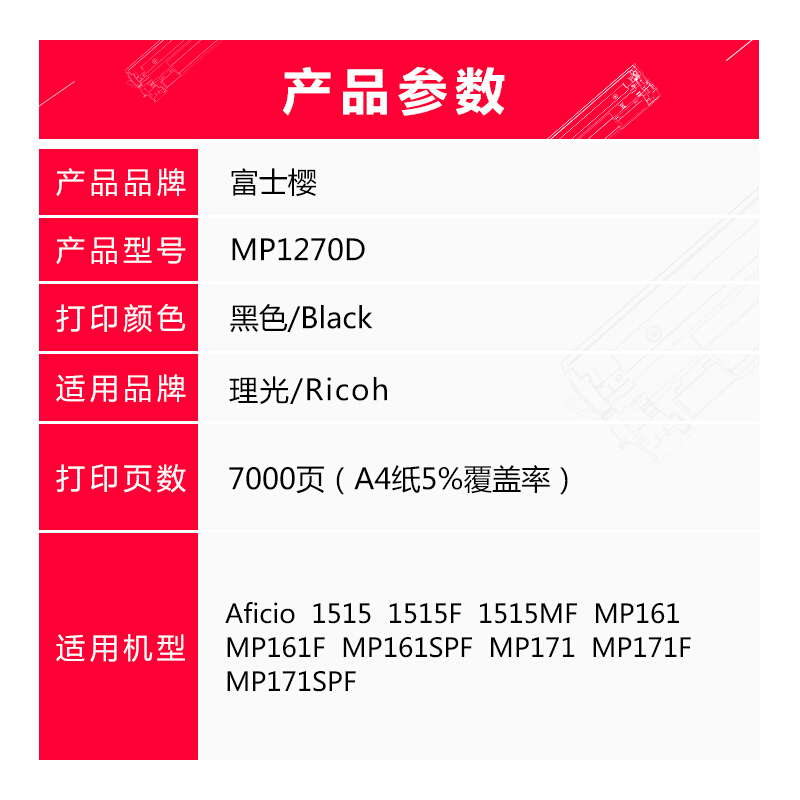 - 富士樱 MP1270D 大容量墨粉盒 适用理光Aficio 1515 1515F 1515MF MP161 161F 161SPF MP171 171F 171SPF碳粉