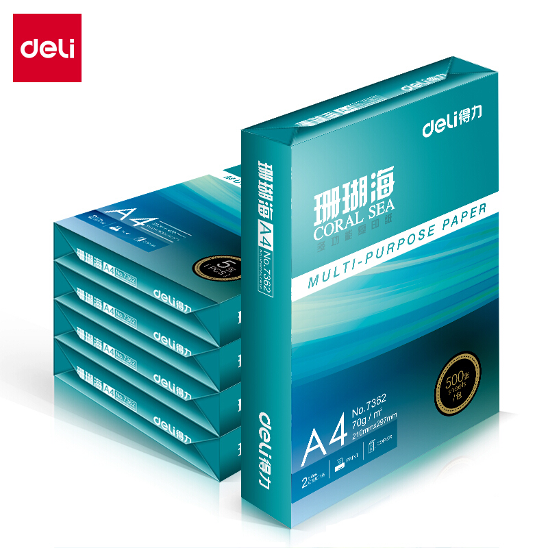 • 得力7360珊瑚海 70g A4 复印纸 中档款打印纸 500张/包 8包1箱(整箱4000张)