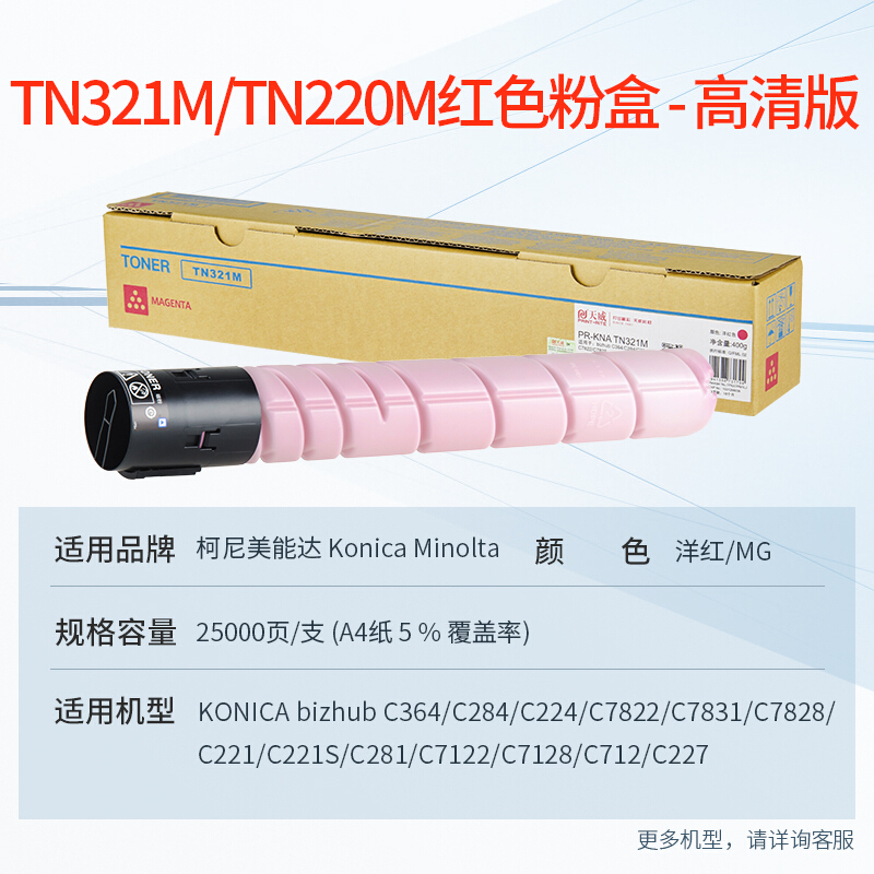 - 天威 TN-321M红色粉盒适用柯尼卡美能达C364 C284 C224 C7822 C7828柯美TN220墨盒C221S C281 C7122 C227碳粉