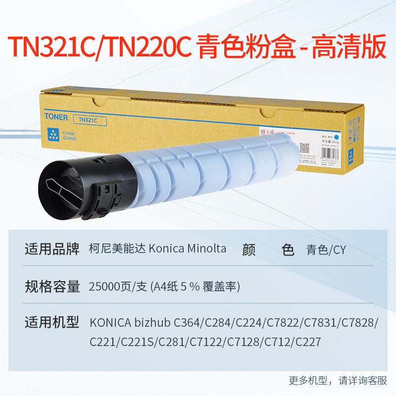 - 天威 TN-321C青色粉盒适用柯尼卡美能达C364 C284 C224 C7822 C7828柯美TN220墨盒C221S C281 C7122 C227碳粉
