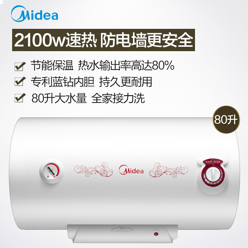 • 美的(Midea)热水器2100W速热安全耐用双重杀菌升级加长防电墙全屋漏电预警80升储水式电热水器F80-21WA1