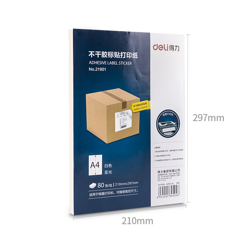 • 得力21901 A4/80张不干胶标贴打印纸 带背胶亚面铜版标签纸 自切割