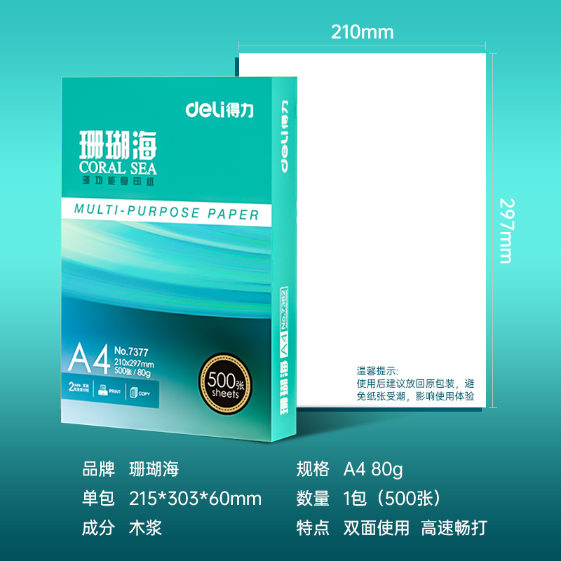 • 得力(deli)珊瑚海A4打印纸 80g克500张一包 单包复印纸 销冠系列 双面加厚草稿纸 7377