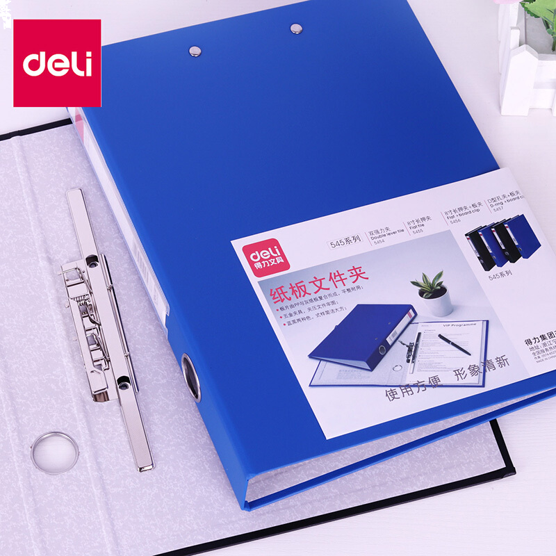 得力(deli)纸板文件夹双强力文件夹板夹A4纸板活页资料弹簧打孔夹子 长押夹蓝色 5455
