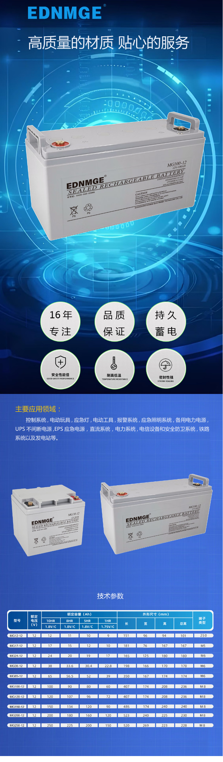 • EDNMGE UPS电池铅酸蓄电池免维护 UPS不间断电源12V120AH MG120-12型