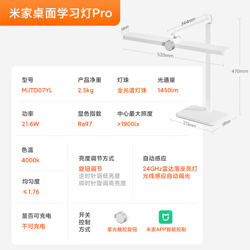 小米米家桌面学习灯Pro智能学习阅读台灯感应柔光护眼灯具MJTD07YL