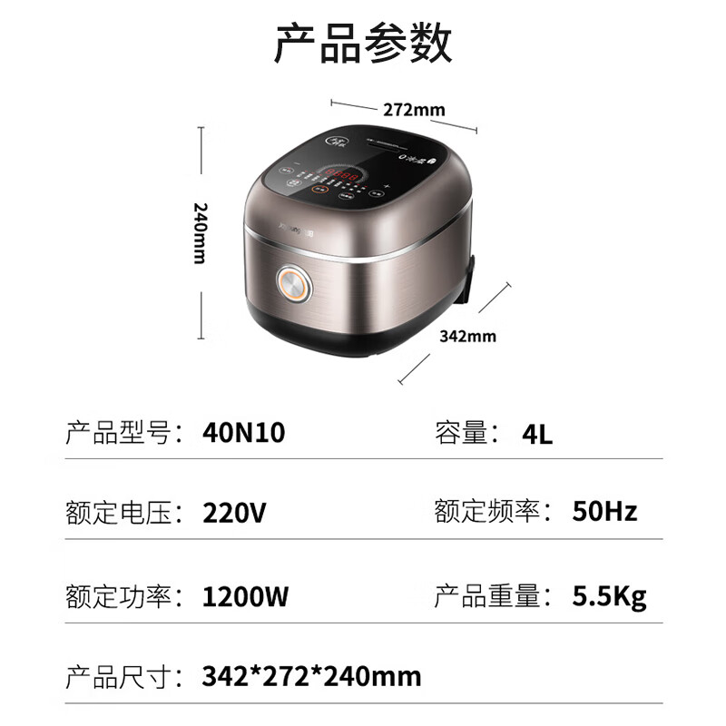 • 九阳(Joyoung)ZMD安心系列 4L大容量3-8人 0涂层防脱落304不锈钢内胆1200W火力IH电磁加热电饭煲40N10