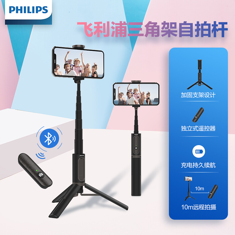 • 飞利浦(PHILIPS)三脚架无线自拍杆 蓝牙遥控 小巧便携 短视频/直播支架 安卓/苹果手机通用 黑色 DLK3618N
