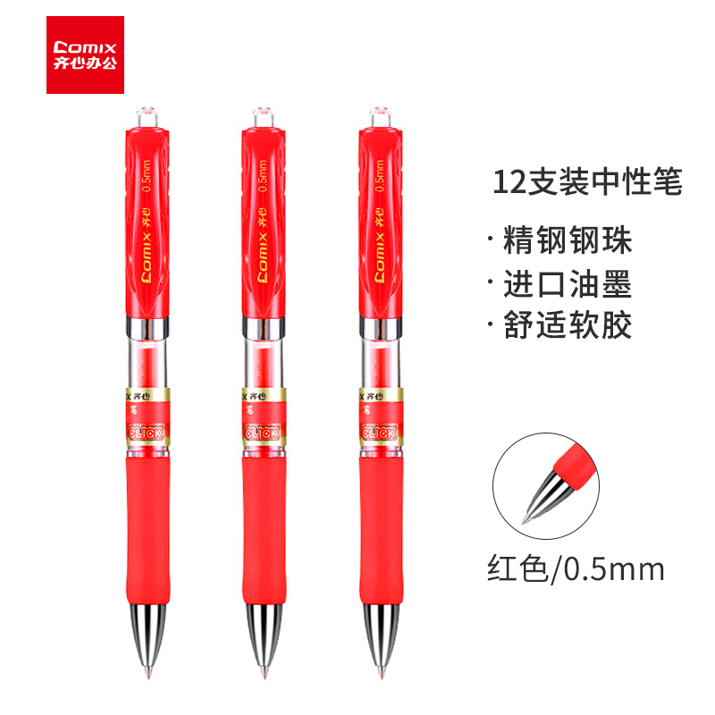 齐心(Comix)0.5mm红色子弹头按动中性笔办公签字笔水笔 12支/盒 EK35