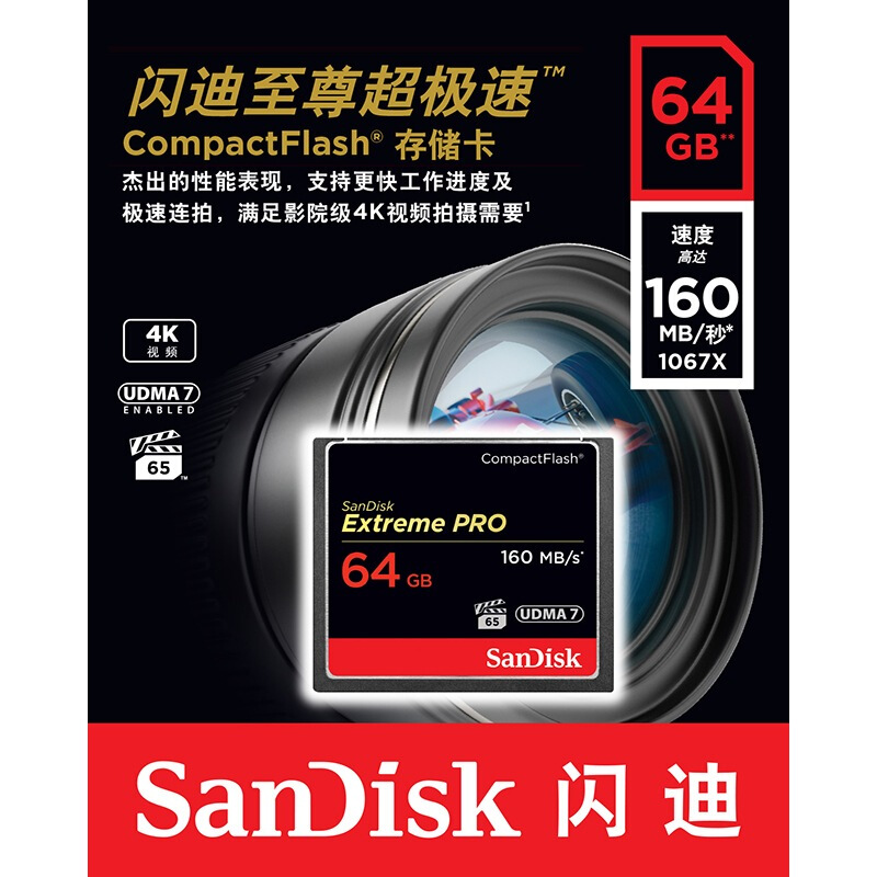 - 闪迪64GB CF(CompactFlash)存储卡 高级单反相机内存卡 UDMA7 4K 至尊超极速版 读速160MB/s
