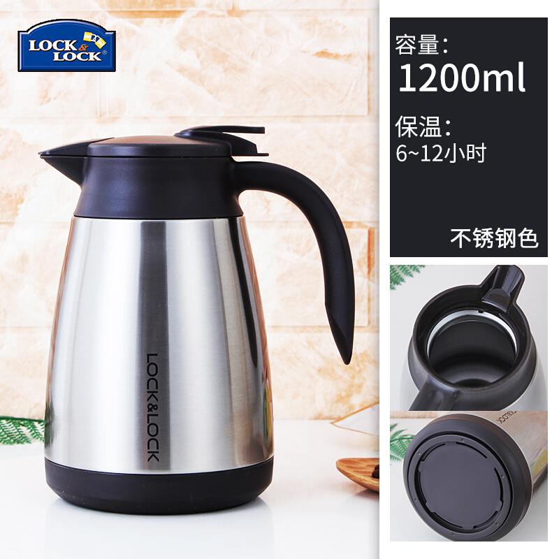 乐扣乐扣 304不锈钢真空保温壶 欧式家用温暖水瓶 大容量保温杯暖壶热开水瓶子 小号咖啡壶茶壶 银色 1.2L