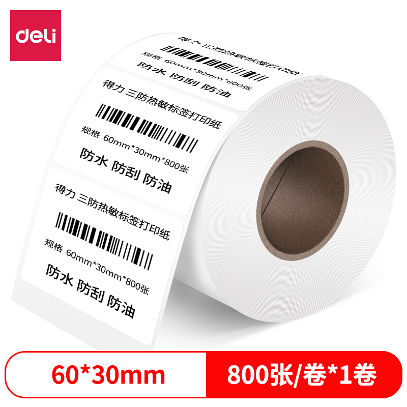得力(deli)60*30mm三防热敏标签打印纸电子面单不干胶打印纸 800张*1卷12017