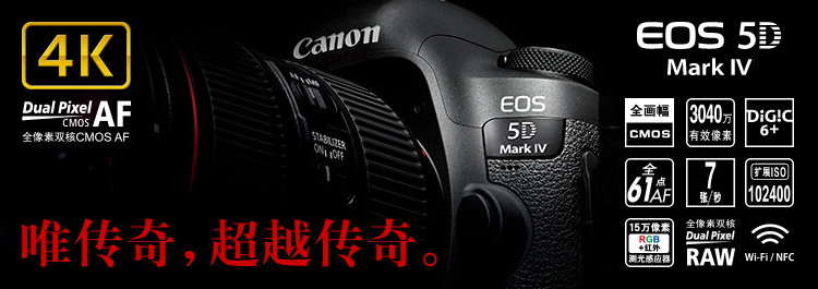 全像素双核技术刷新高画质概念。一个像素具备两个光电二极管,兼顾像面相差检测自动对焦及像素成像,可读取被摄体纵深信息,方便后期对图像进行多维度处理。DIGIC 6+为代表的多个图像处理单元高效联动,实现更高的画质。光学取景拍摄系统支持专业级瞬时捕捉,实时显示拍摄系统令精细创作更加便捷。两系统结合轻松应对多种拍摄环境。充满视觉震撼力的影院级4K分辨率提升视频捕捉的品质。以高画质记录美好瞬间,EOS 5D Mark IV带你进入高画质的新境界。
