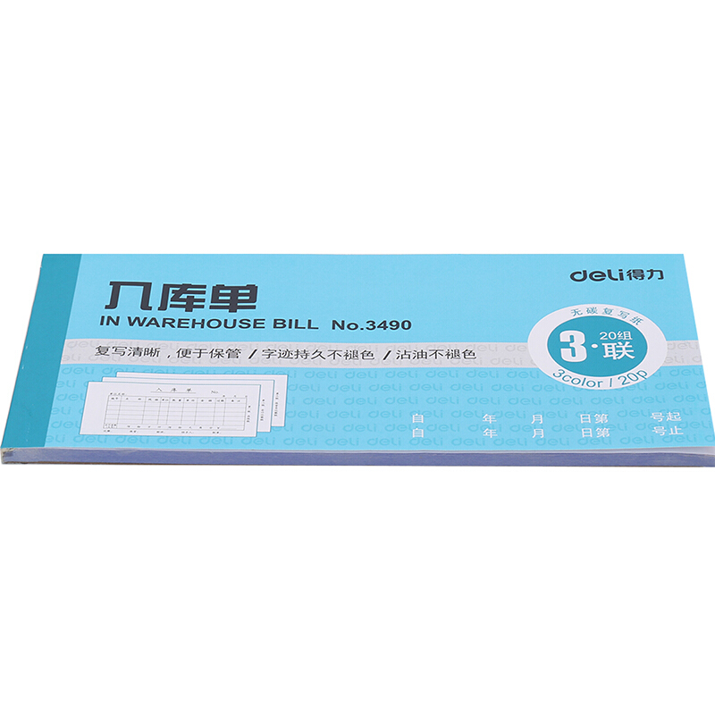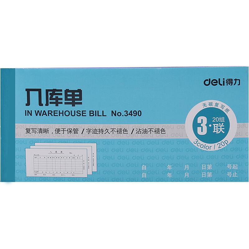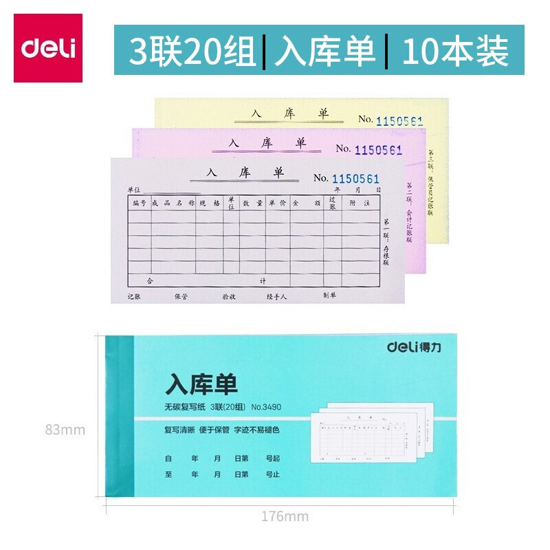 • 得力(deli)三联横版入库单 无碳复写单据 财会用品 经济款10本装3490