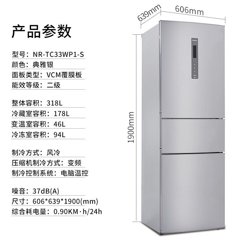 松下(Panasonic)NR-TC33WP1-S 318升自由变温室 微冻保鲜三门风冷变频无霜冰箱