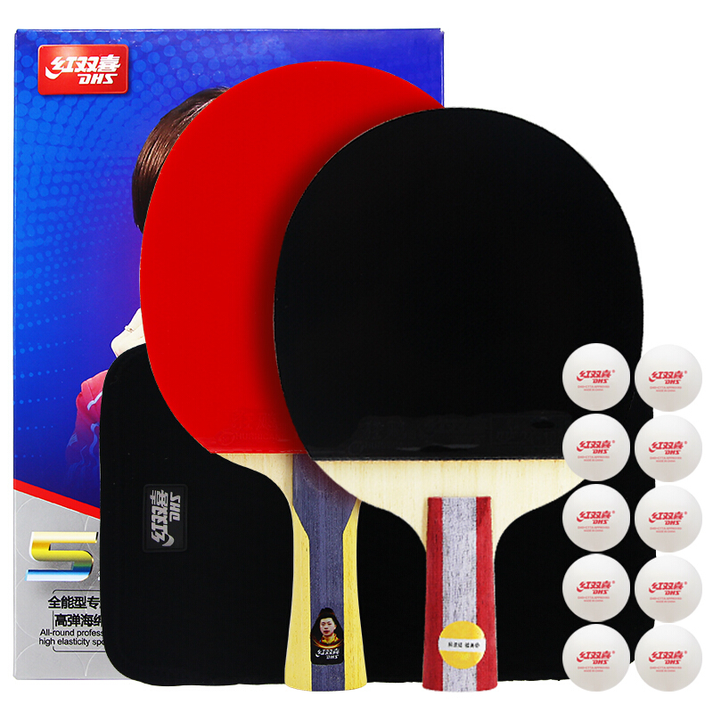 红双喜DHS 五星级乒乓球拍横直拍套装T5(附拍包乒乓球)