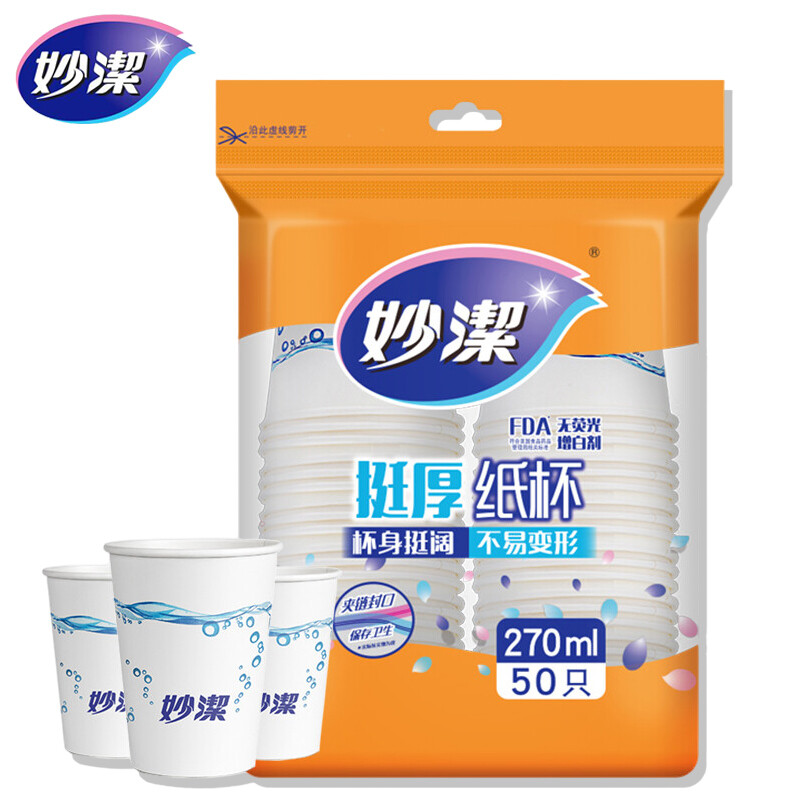 • 妙洁 一次性纸杯9盎司加厚防烫270ml50只大号挺厚纸杯
