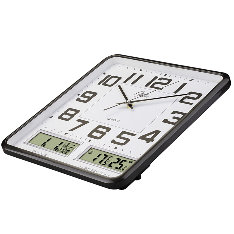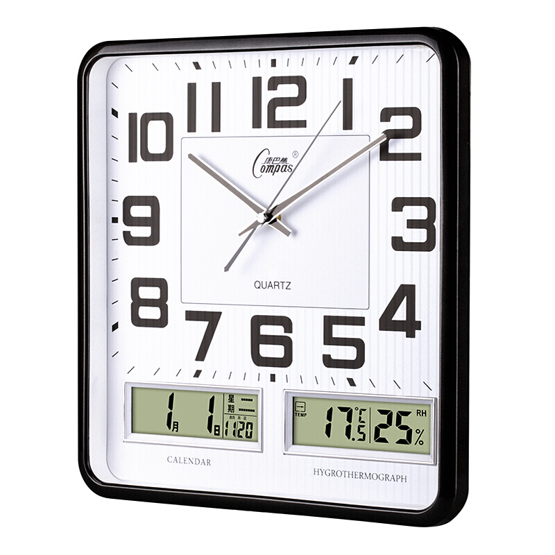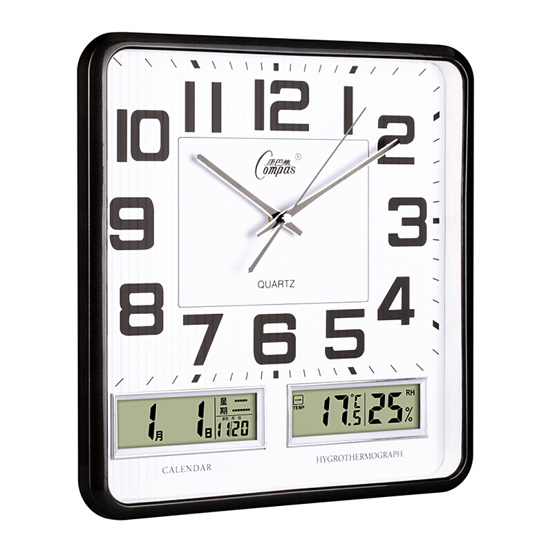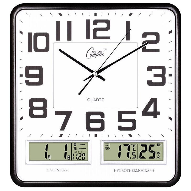 康巴丝(Compas)挂钟16英寸万年历温湿度钟表客厅时钟 简约方形日历石英钟表挂墙C2983 黑白