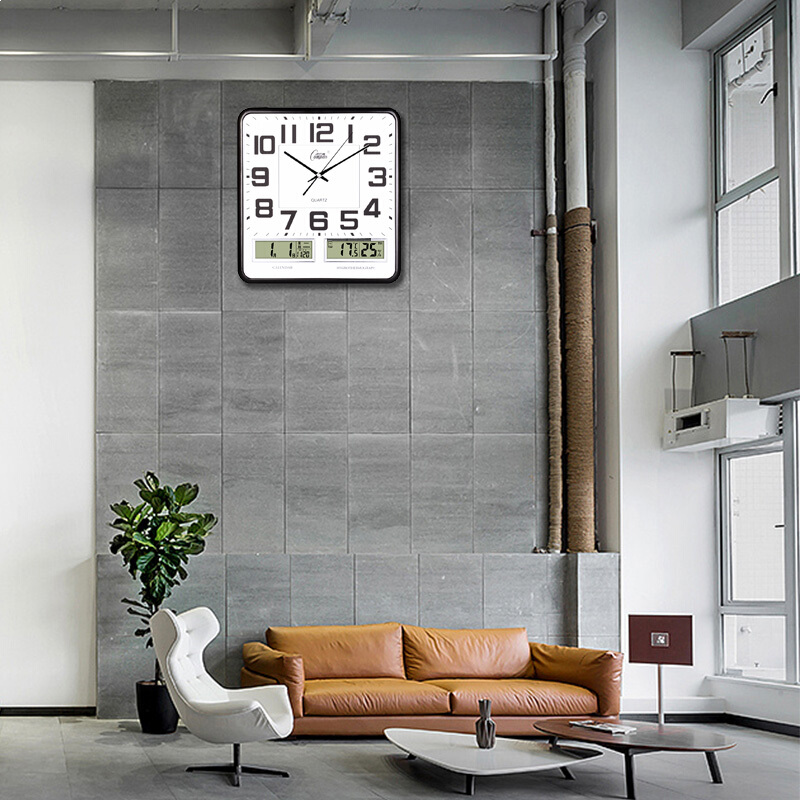 康巴丝(Compas)挂钟16英寸万年历温湿度钟表客厅静音时钟 简约方形日历石英钟表挂墙C2983 黑白
