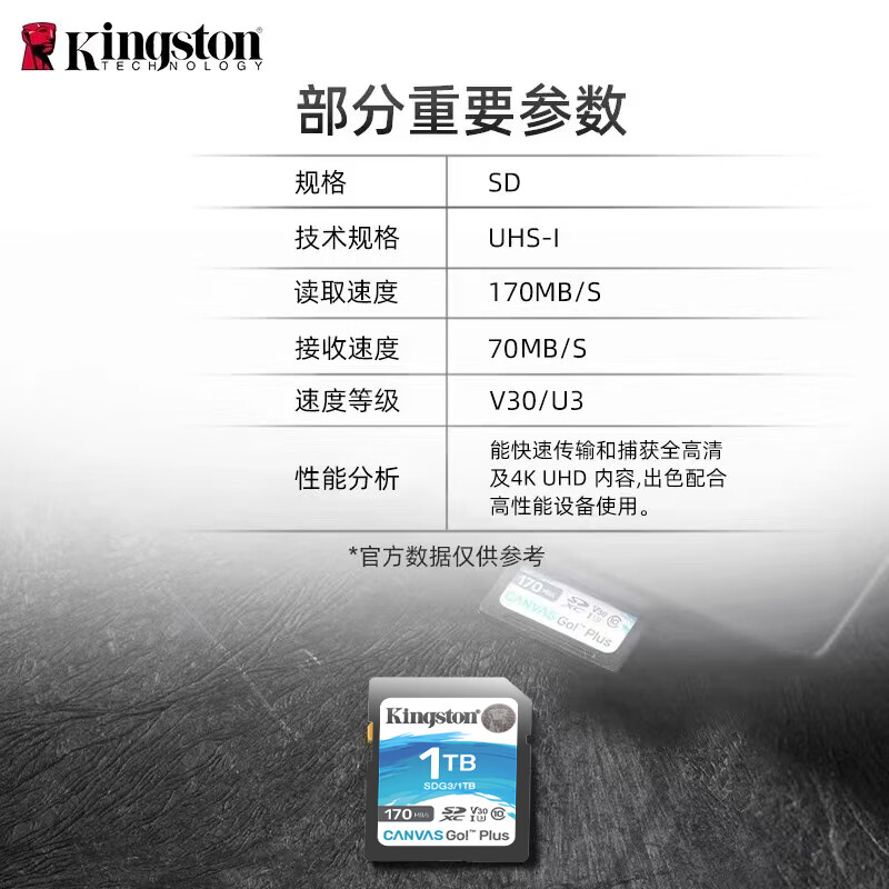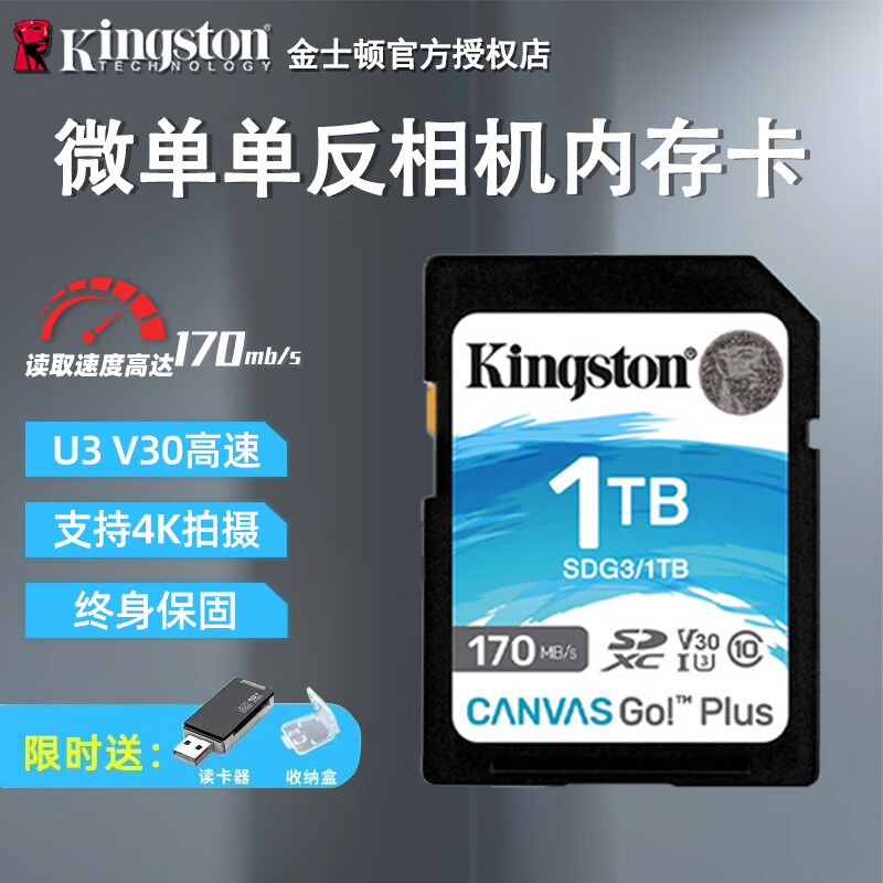 • 金士顿(Kingston)sd相机卡佳能索尼尼康富士相机内存卡高速单反微单sd卡4K高清视频拍摄UHS-I单反专用存储卡U3 V30 【170M/S】 SDG3/1TB