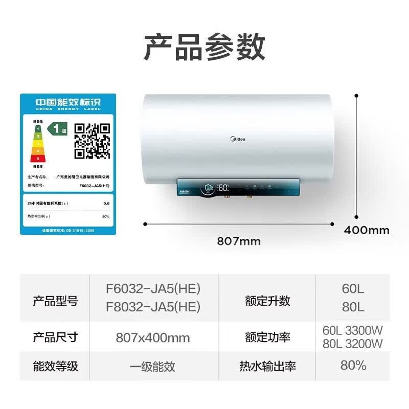 • 美的(Midea)F8032-JA5(HE)电热水器 一级能效 速热节能 水质监测终身免换镁棒出水断电 80L 3300W