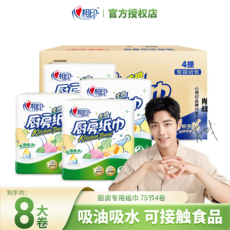• 心相印厨房用纸家用吸油吸水纸巾卷纸心心相印厨房清洁卷筒纸整箱4提共8大卷厨房卷纸