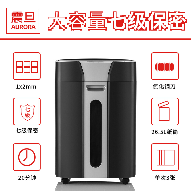 震旦AURORA 专业超细碎办公大功率大型碎纸机 7级保密 3张20分钟26.5L静音 AS0312